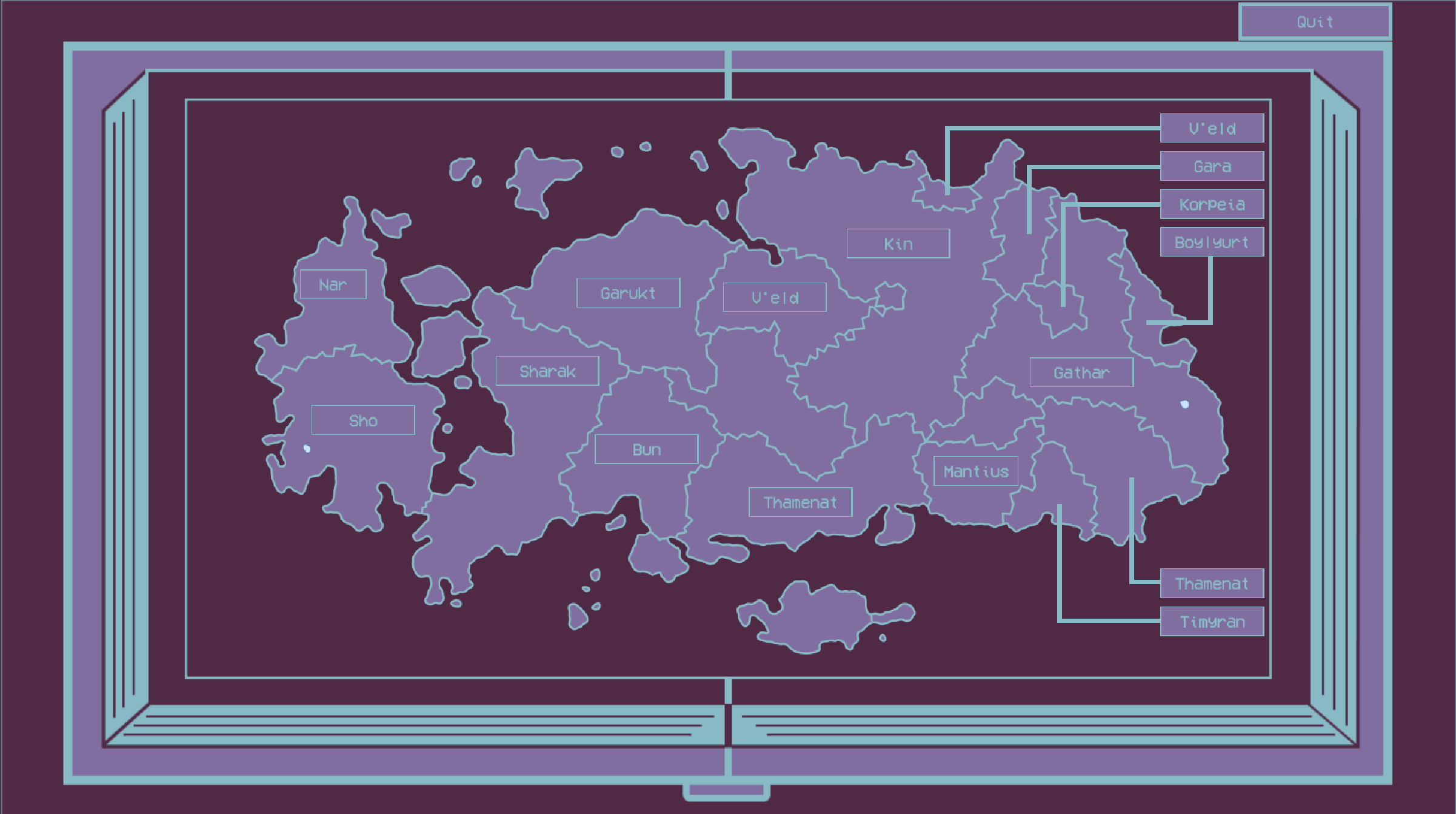 Disclaimer: The landmass/world was generated using Azgaar's Fantasy Map Generator (nation names and deity names were also pulled from this generator). Ruler names were generated using Fantasy Name Generator. Many of the other random elements were generated by asking ChatGPT and Microsoft Copilot for random results. Parts of the game code were guided through troubleshooting with Microsoft Copilot. This project is more of a proof of concept and fun hobby to work on, and is not intended for sale.