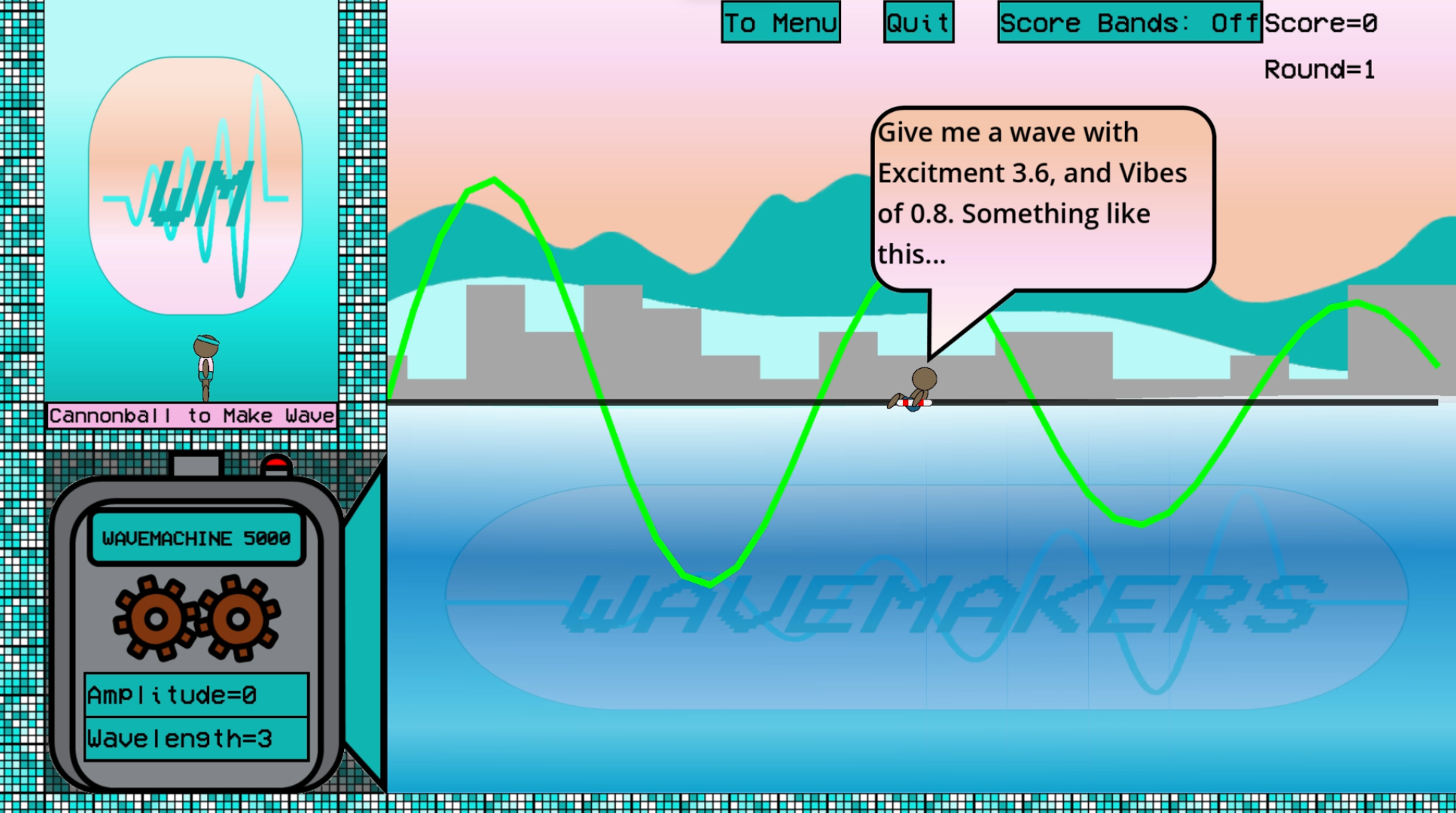 You are the Wavemaker, and it’s your job to make the wave with an Wavelength and Amplitude that matches the requested wave Vibes and Excitement that the various pool-goers will have. Remember the WAVES formula: Wavelength*Amplitude-Vibes*Excitement = Score!